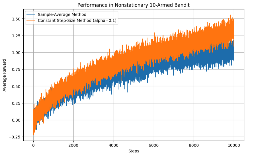 For each step (from 1 to the total number of steps): Select an action using the ε-greedy policy for each method. Generate a reward based on the action selected and the true value of that arm. Update the true action values by adding a random walk increment to simulate the nonstationary environment. Update the action-value estimates for both methods using their respective update rules (sample-average and constant-step-size).